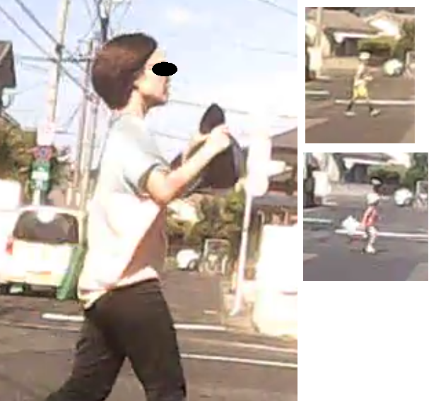 まず、子供2人が歩道を歩いて行き、その後、