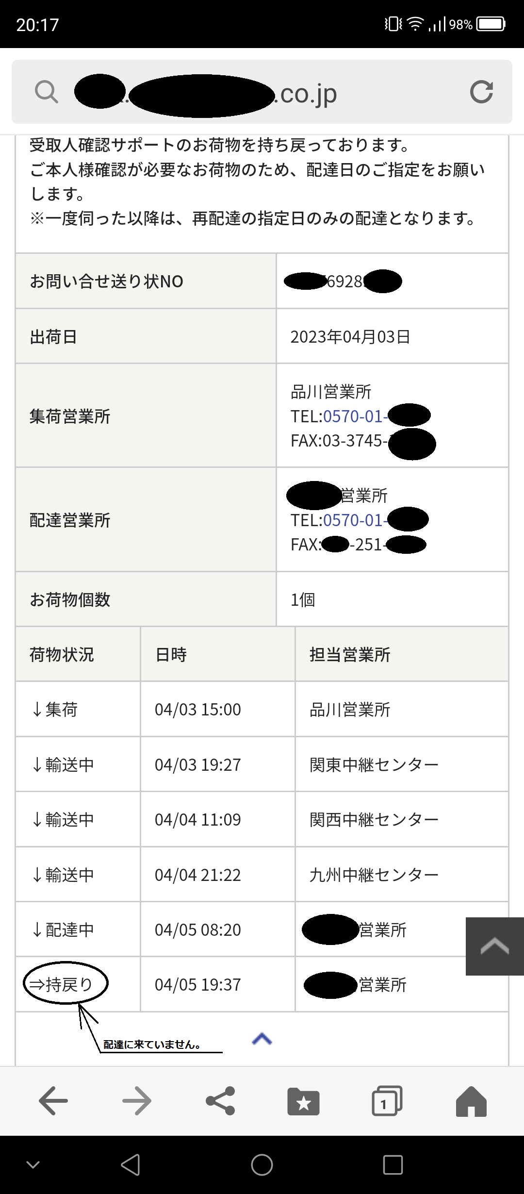 2023/04/05 PM7:37 宅配便の「持戻り」となっていました。